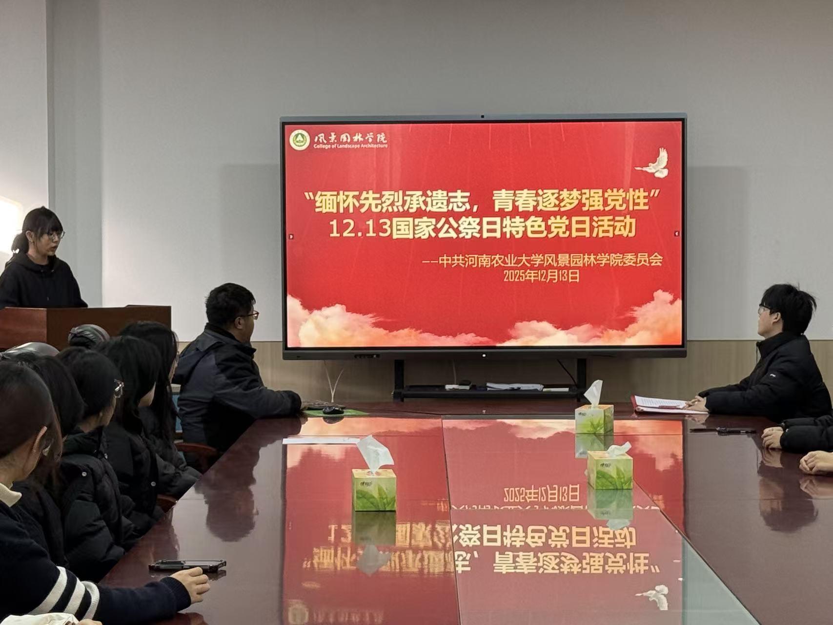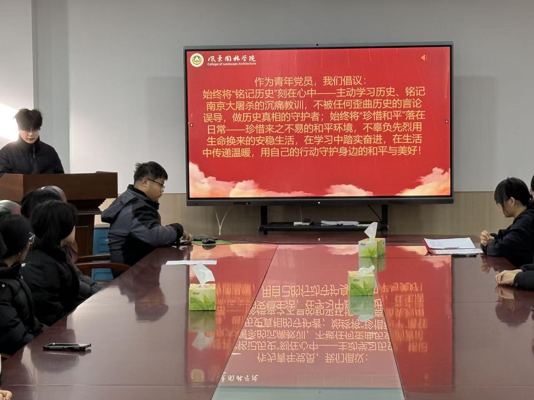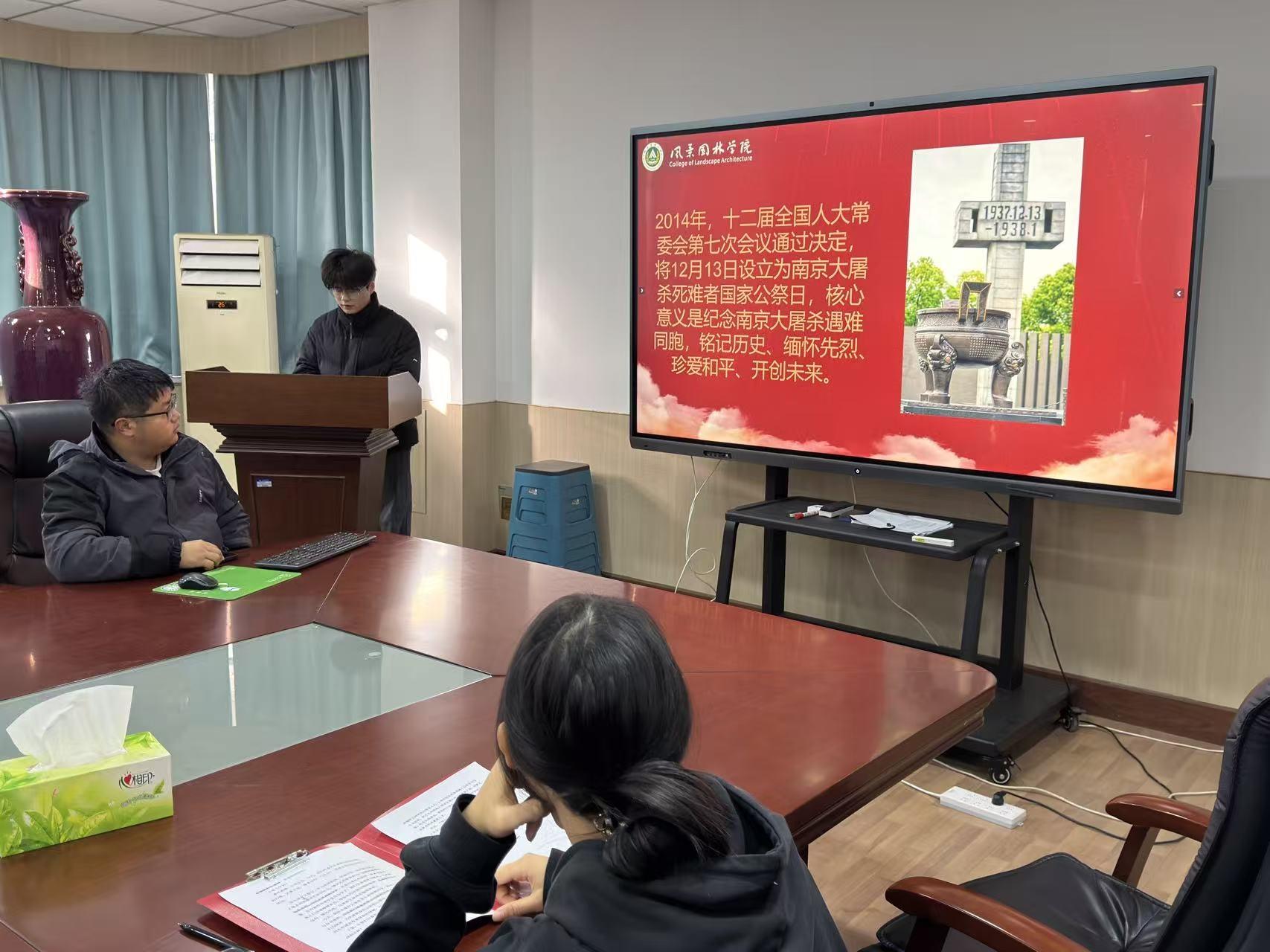 风景园林专业学生党支部组织支部内党员、党建学生干部以及团委、学生会骨干成员,开展以“缅怀先烈承遗志,青春逐梦强党性”为主题的国家公祭日红色党日活动。活动由兼职辅导员王佳琪主持,党建负责人韩建聪担任主讲。