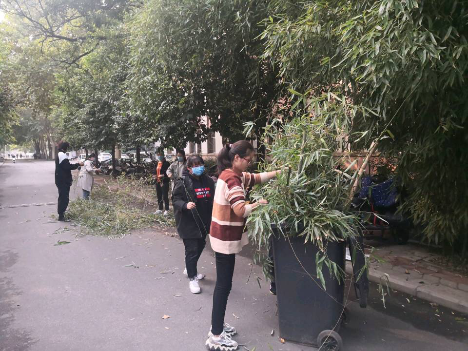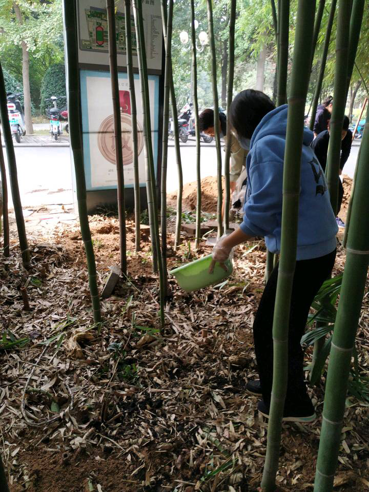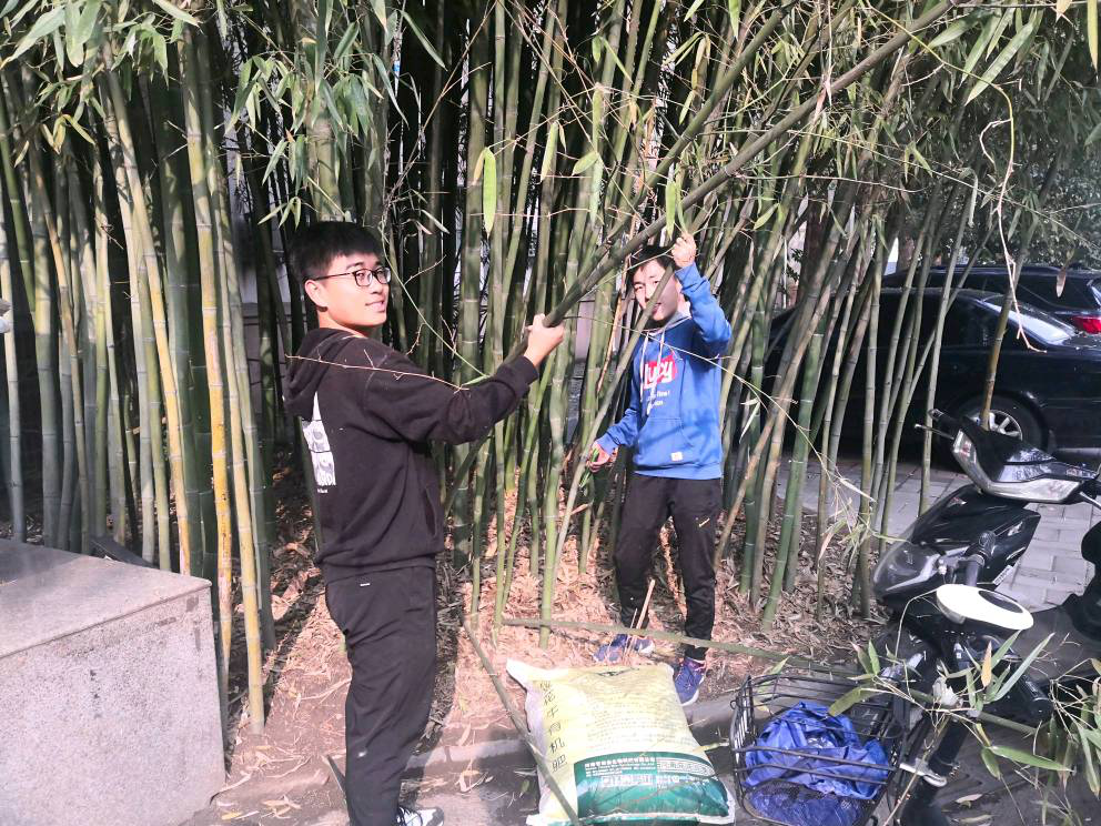 劳动实践过程中,班级师生齐心协力、分工合作对二号楼前的两处竹林绿地进行了整理改造。师生结合专业对竹林的地形进行平整,疏松土壤,播撒肥料,安插篱笆,清扫垃圾和落叶,对老株残株进行修剪。在师生共同努力下,使竹林绿地疏密有致,风貌焕然一新,愈加生机勃勃。