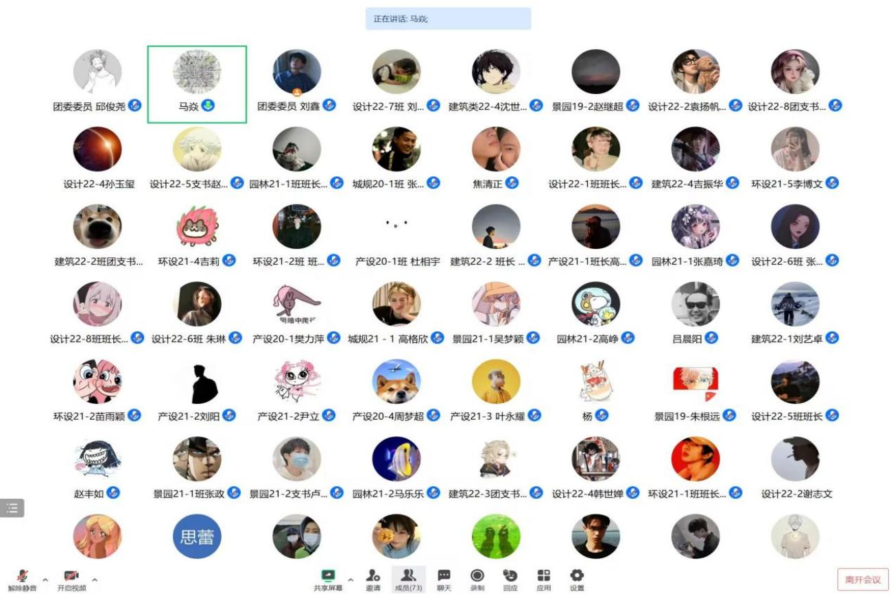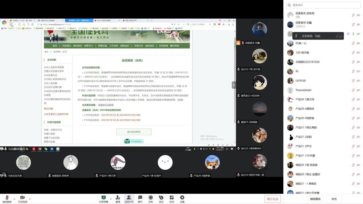 团委老师马焱于5月11日晚主持召开应征入伍线上动员宣讲会,各年级班长支书及有参军意向学生参会。