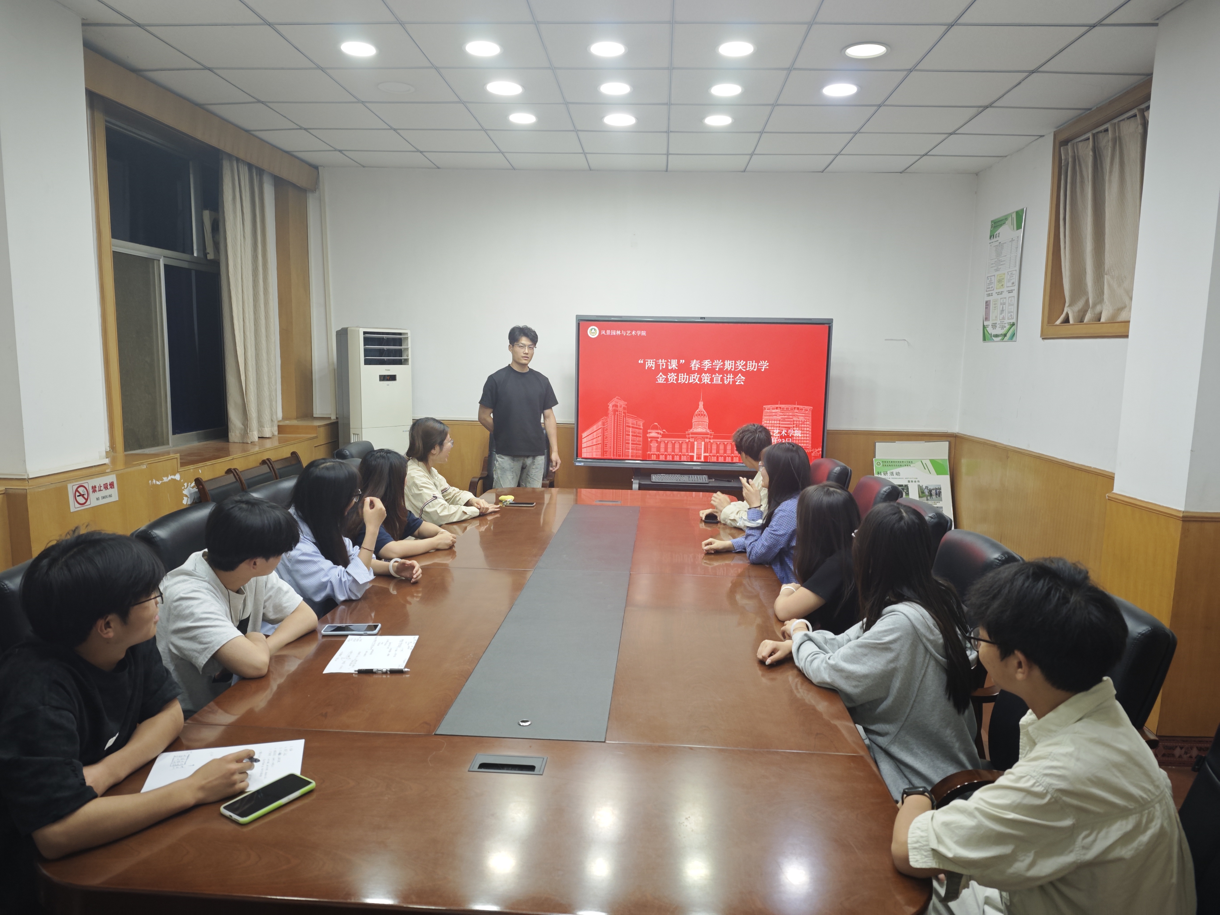 于文化路校区13号楼第一会议室召开资助“两节课”资助政策宣讲会。院团委老师组织团委学生干事、各班班长支书代表参加会议。