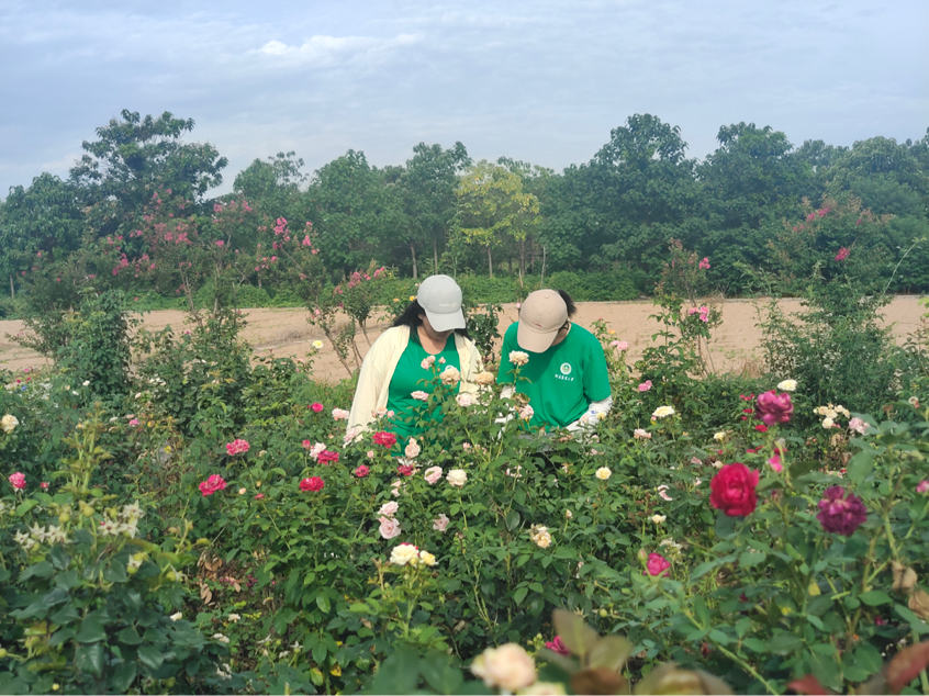 活动中,团队成员在园区工作人员的指导下有条不紊地开展植物学习实践活动,对部分月季进行梳整打理,并对各色月季的花型、品种、瓣茎和叶刺状态进行细致比对和详细记录。实践团队成员充分发挥其专业优势,全心投入、默契配合,坚持“受教育、长才干、作贡献”的宗旨,以实际行动投身农业建设,用无私奉献展示青春活力。
