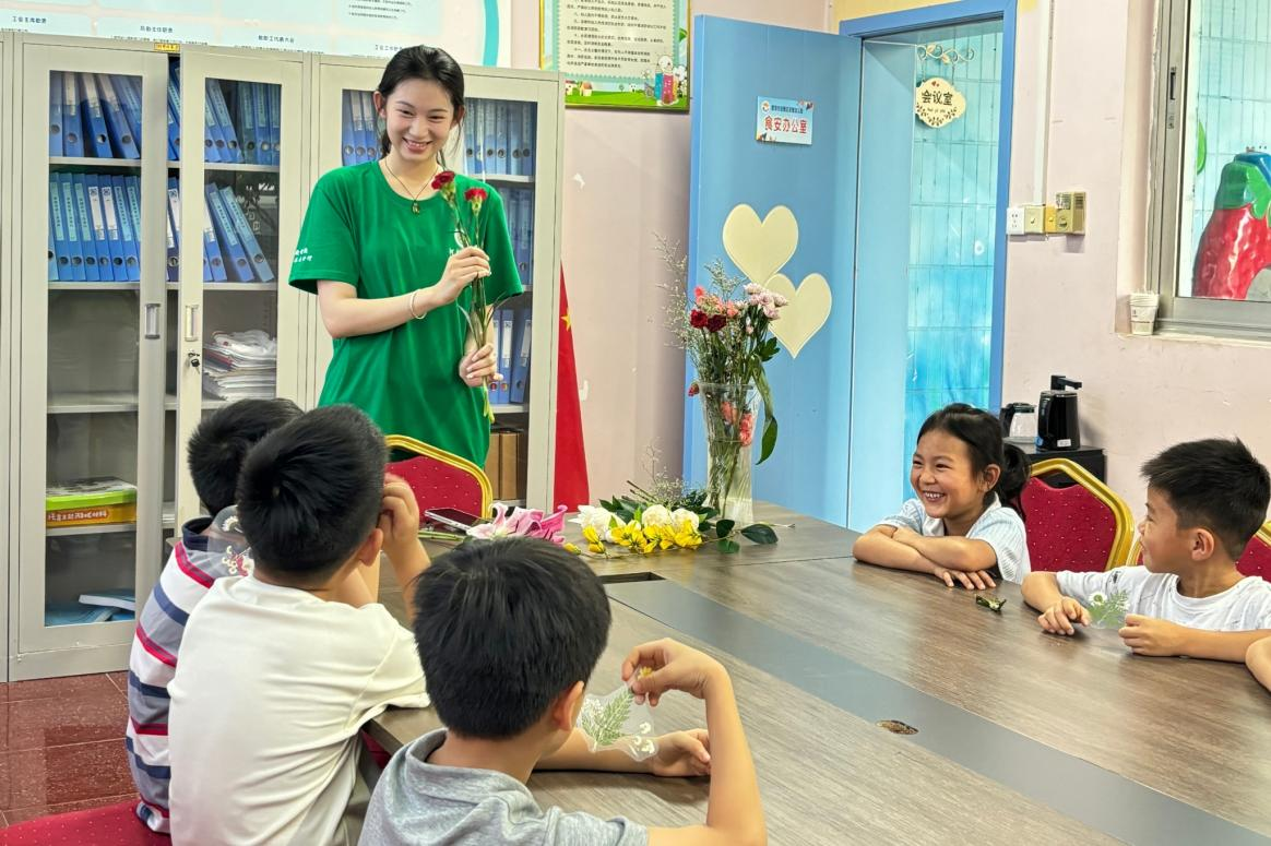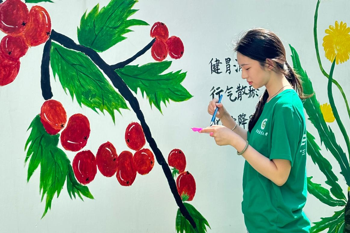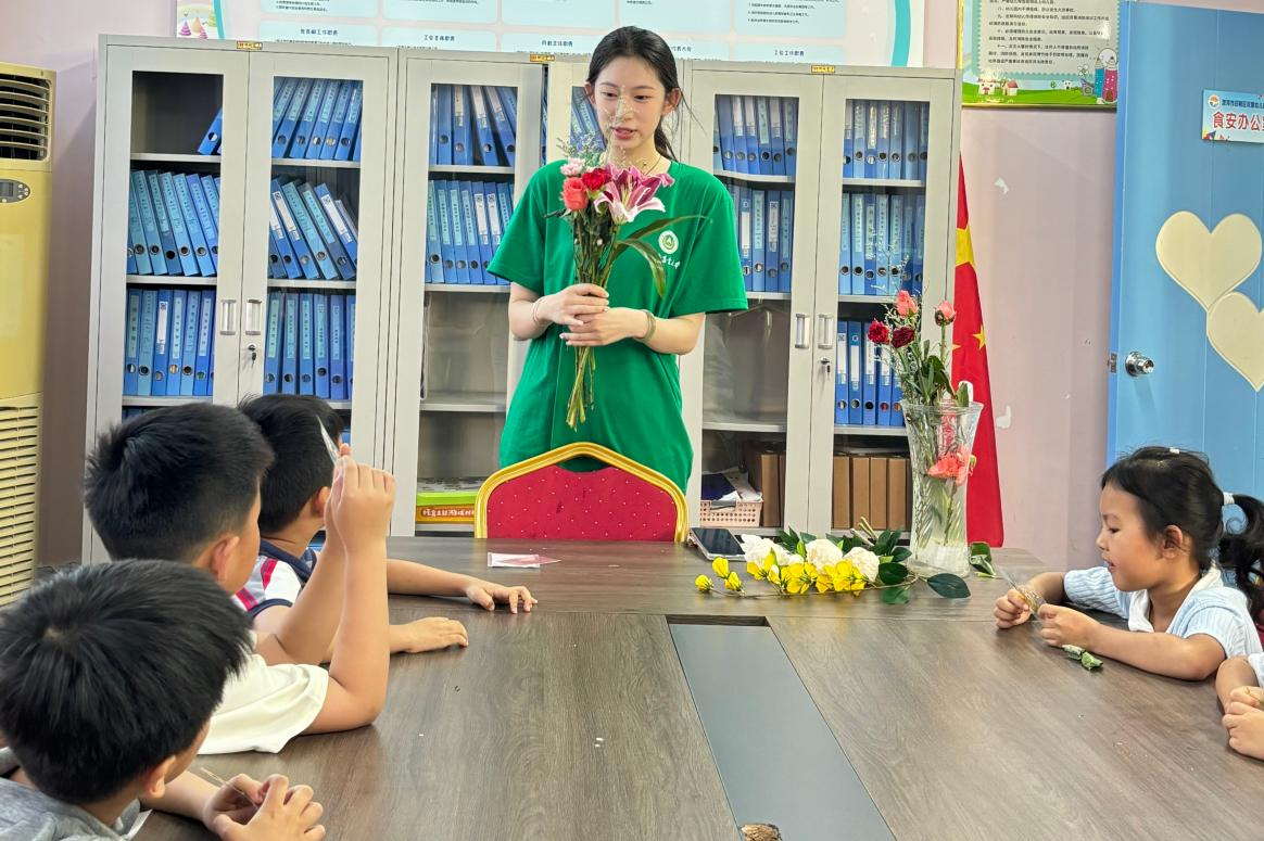 活动伊始,社团志愿者化身“花艺导师”,以趣味科普的形式带领孩子们认识玫瑰、百合花、满天星等十余种花材。从花材习性到色彩搭配原理,用通俗易懂的语言和生动的示范,将晦涩的花艺知识转化为易于理解的趣味课堂,带领孩子们感受花朵的魅力。此外还帮助社区绘制墙绘,增添新的风采。