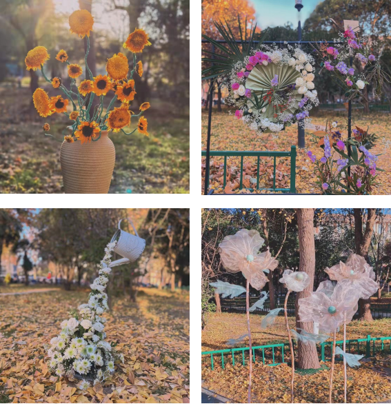 走近牧医广场,伴着小雪天气的丝丝寒意,阵阵沁心花香扑鼻而来,各种插花作品令人眼前一亮。参展作品以展现季节交替之美为主题,将审美教育与专业课程相融合。活动前期,同学们充分发挥艺术想象力,精心构思,将专业知识与实践操作相融合,对各种废旧材料加以利用,将多种花材修剪、整枝,根据不同的色彩、形状有层次地搭配在一起,将绿色可持续发展的设计理念融入学习实践中。学生现场制作并展出了色彩艳丽、造型独特、创意新颖的插花作品共6件。作品《张狂》由绚丽的黄色色系组合,花瓣富有张力,线条不羁、大胆肆意、坚实有力,在明亮而灿烂的底色上构成不同的色调与气势,把朵朵向日葵表现的动人心弦;作品《爱丽丝漫游仙境》柔美的锦缎之中点缀珍珠,用柔软的纱布包裹缠绕成绚丽多姿的花朵,借助不同材料的不同质感将梦幻之美带入现实;作品《花间一壶酒》独具创意,运用大大小小、不同层次的花朵将水流倾泻之态淋漓尽致的表现出来。此次展览迎来学校广大师生驻足观赏。