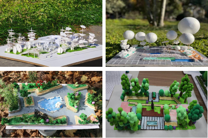 经过草图设计、修改调整、确定方案等步骤,学生利用手绘及各类计算机软件辅助等方式,将融设计、创意、色彩搭配为一体的计算机数字模型呈现。在刘志军和李昂的带领下,学生以绿色、可持续发展为原则,寻找废旧物进行实物模型制作,亲自感受设计从数字模型转向实体的过程。接着,通过室外拍照的艺术方式,学生对光影带来的空间效果有了新的认识。同学们将课堂理论和实践应用进行交融衔接,结合区域实际需要进行针对性设计。作品《红枫书屋》延续传统建筑的肌理与布局,构建层次丰富的空间,实现了传统的坡屋顶形式的现代化转译;作品《开▪导》本着极简主义、低影响开发的设计理念,展现艺术与自然的和谐关系;作品《乐活广场》将场地界面打开,一切从人出发,充分重视人的心理体验;作品《求是园▪力行园》以人为本、结构多样、富有弹性,反映校园文化,传承学校人文精神。