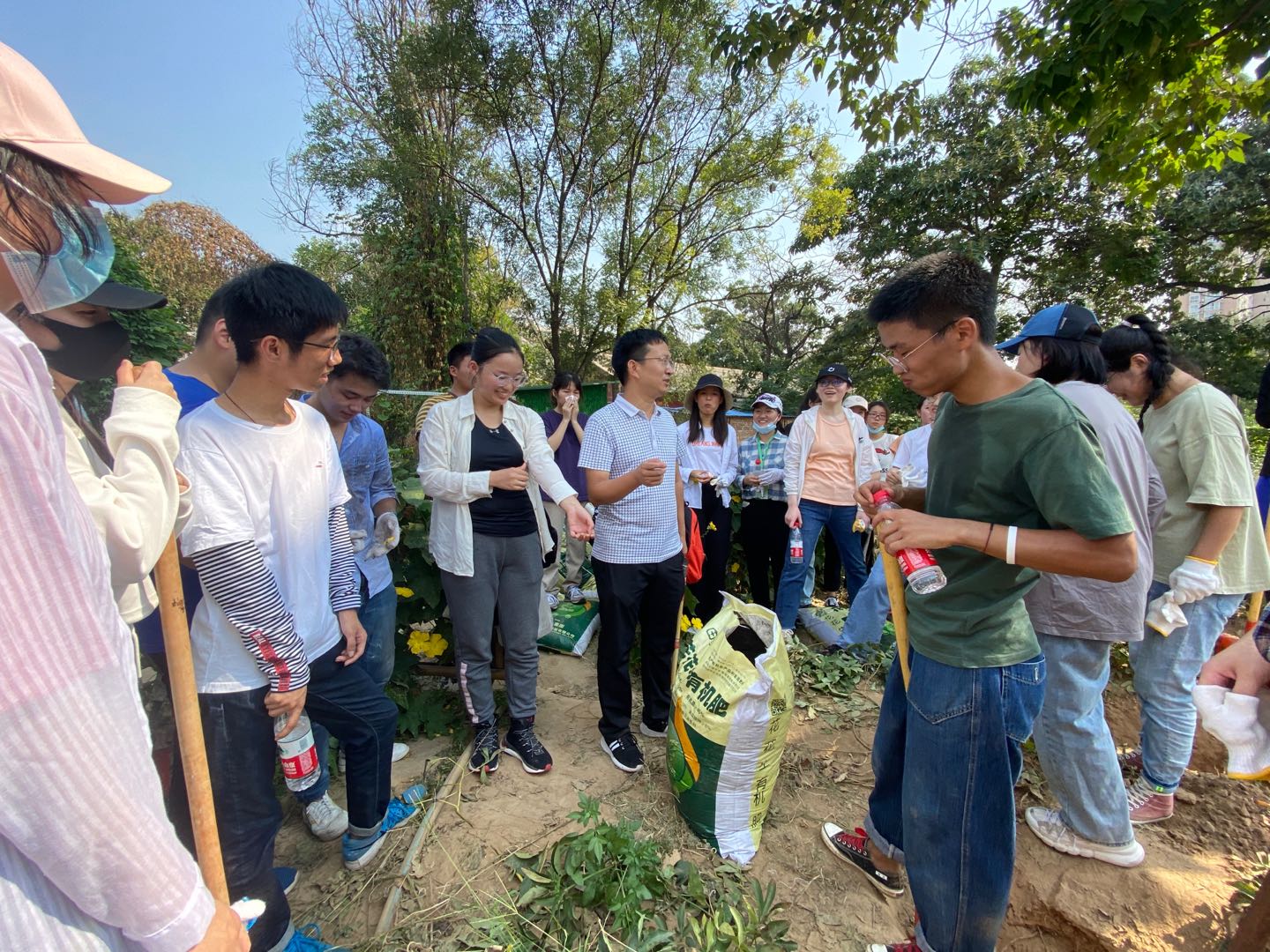 首先,老师带领同学们来到基地,对现场情况做了精练的概括介绍。今天的工作主要是对田垄的芍药花进行除草、施肥和灌溉。讲解完实践内容,风景园林两个班的学生四人一组,每组一列,开始投入实践中。第一阶段是两人除草,两人挖施肥沟。每人一把铁锹开始挖沟,宽度和深度均与铁锹片齐平。如若施肥沟过深,则施肥时肥料洒多,会造成芍药烧苗现象。如若施肥沟过浅,则肥料只掩盖一层浮土,易被激流冲走。第二阶段是施肥,有机肥和复合肥被均匀地摊在沟底。两人施肥,两人在后面将覆土盖平。肥料是由动物粪便加工而成的,养分含量很高。第三阶段是灌溉,旋转的喷水头浇灌着每一株芍药,促进植物对养分的吸收。