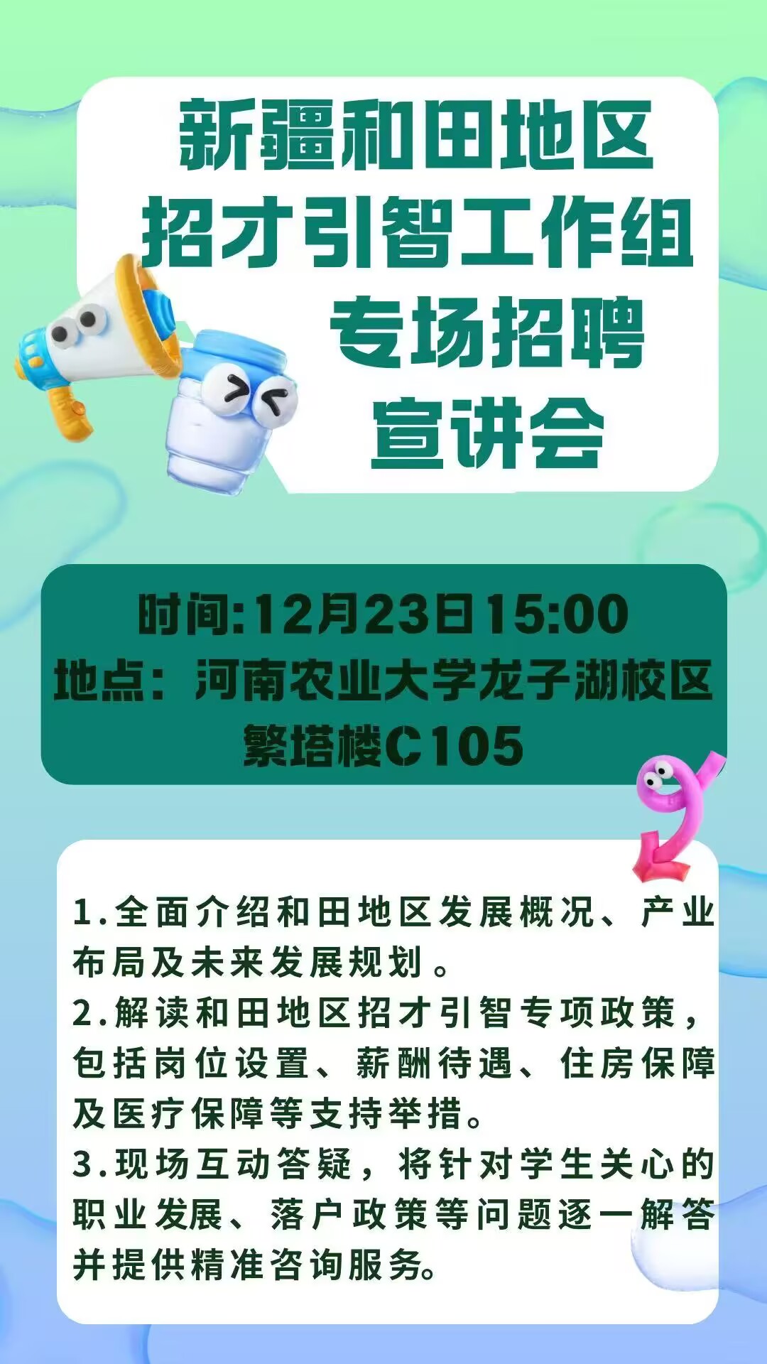 各位同学请注意,新疆和田地区招才引智工作组专场招聘宣讲会即将来袭,12月23日走进裸体直播 龙子湖校区!