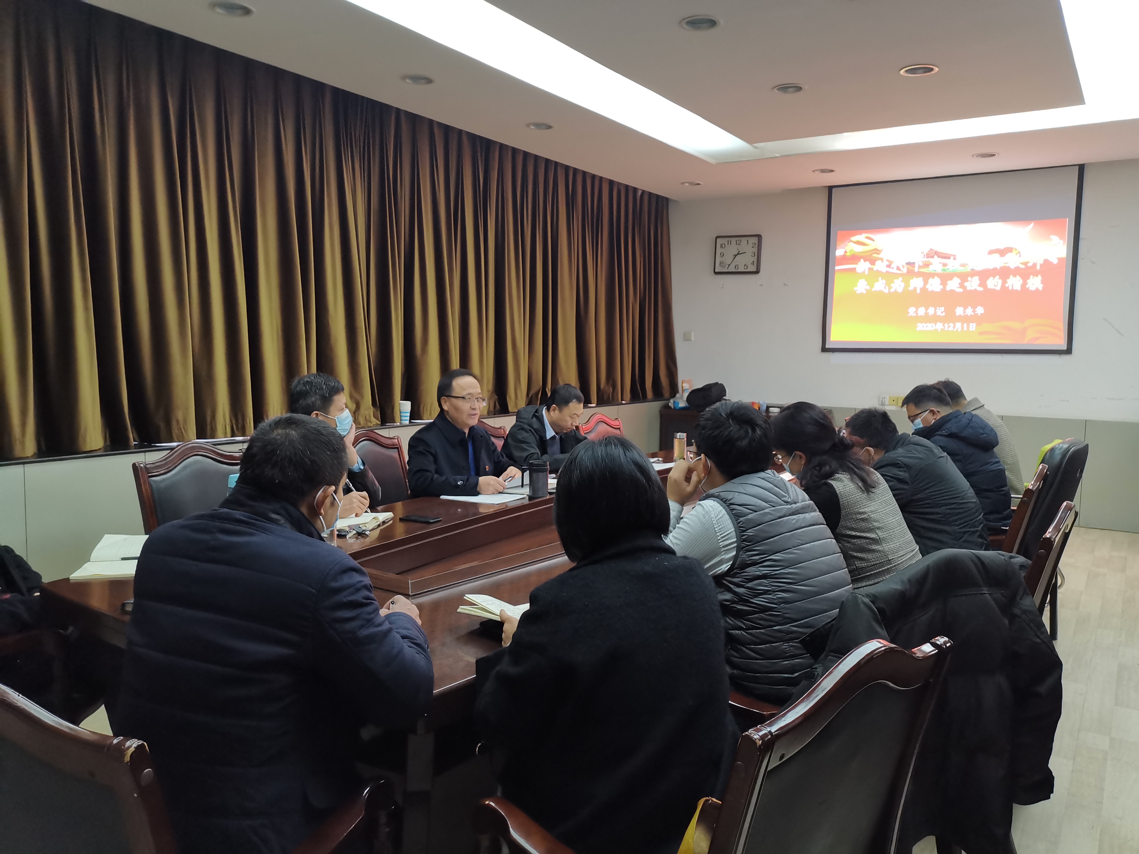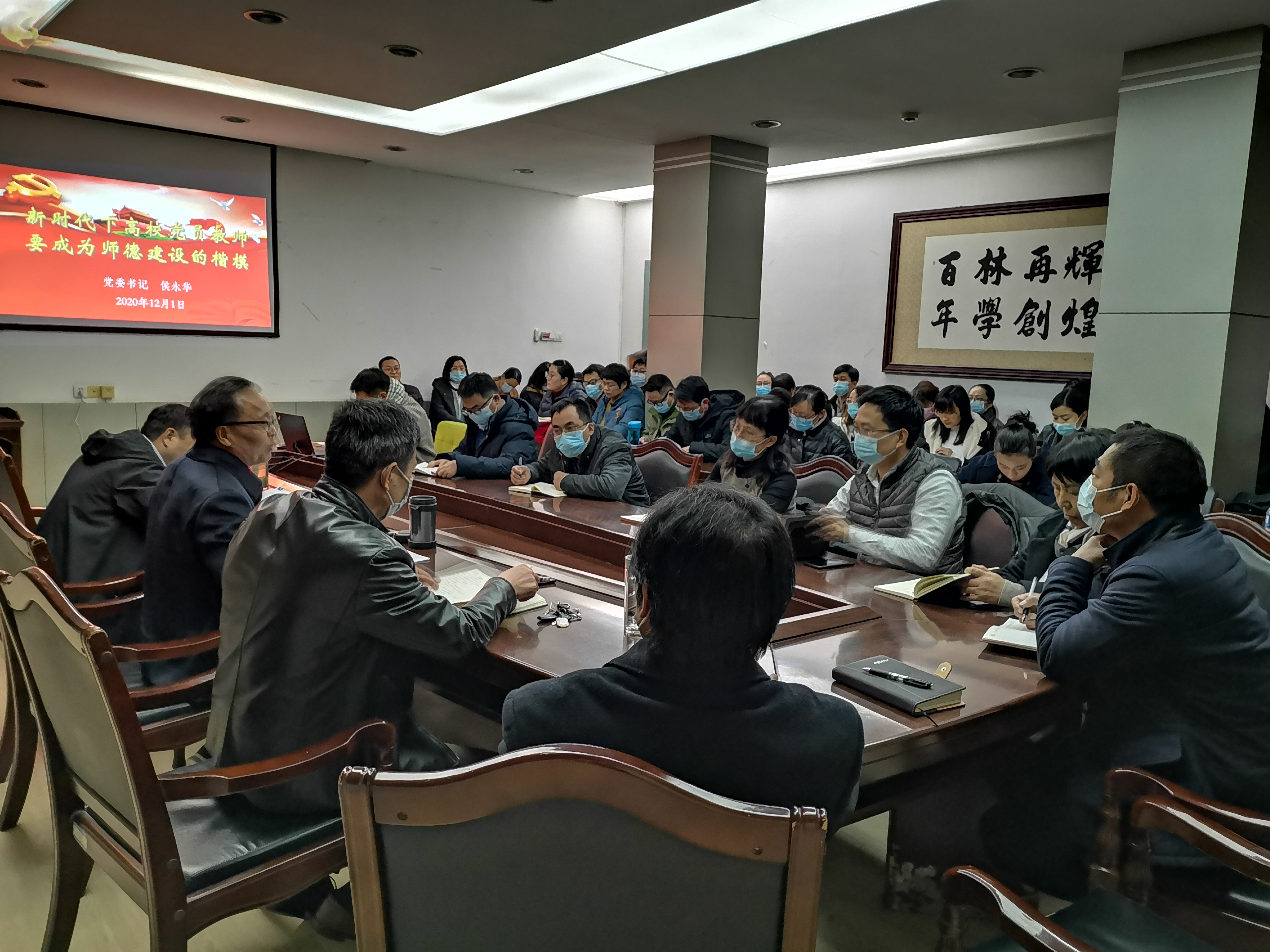 为深入贯彻落实党的十九届五中全会精神,按照学校《关于举办2020年师生党员培训班的通知》要求,12月1日在2号楼二楼会议室,院党委书记侯永华为全院教工党员作题为《新时代下高校党员教师应成为师资建设的楷模》的主题党课。