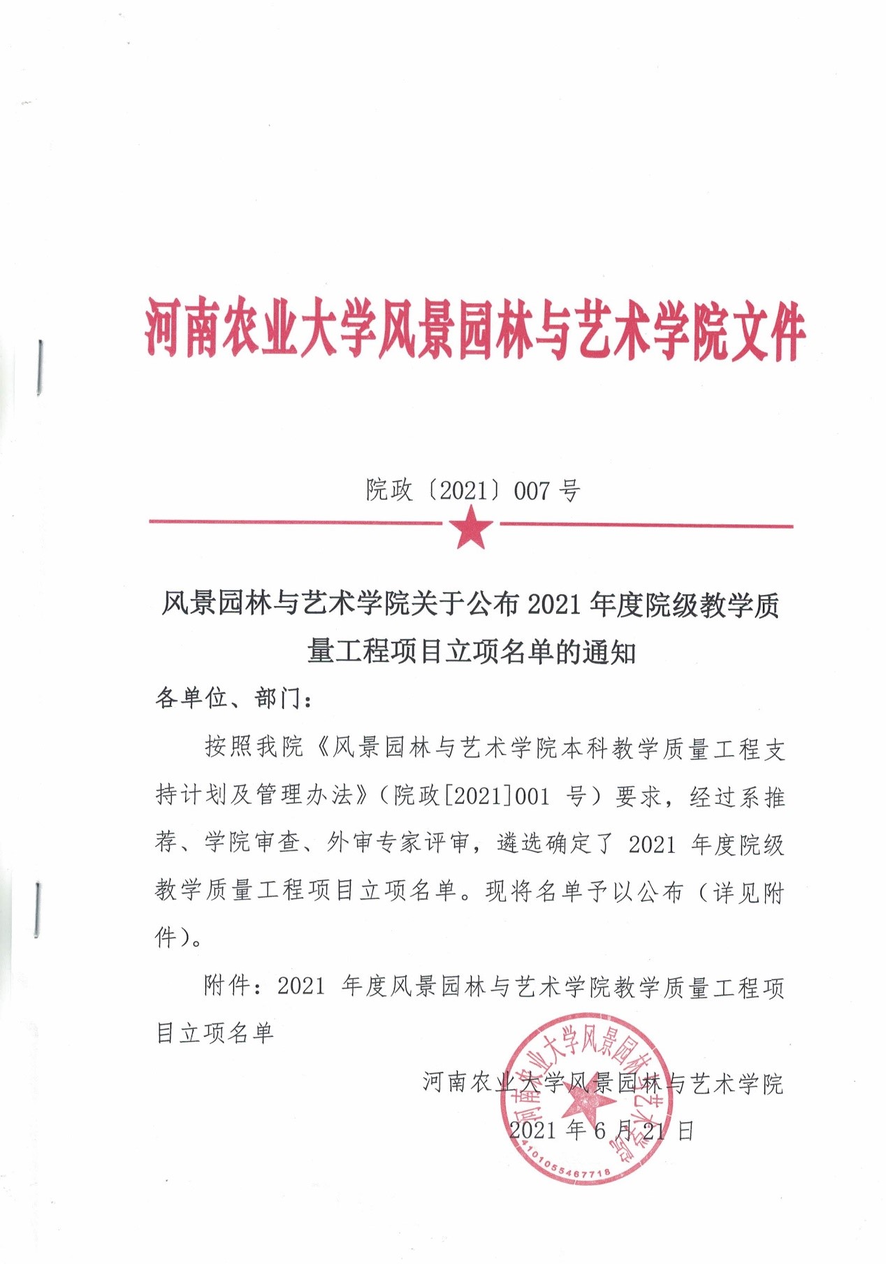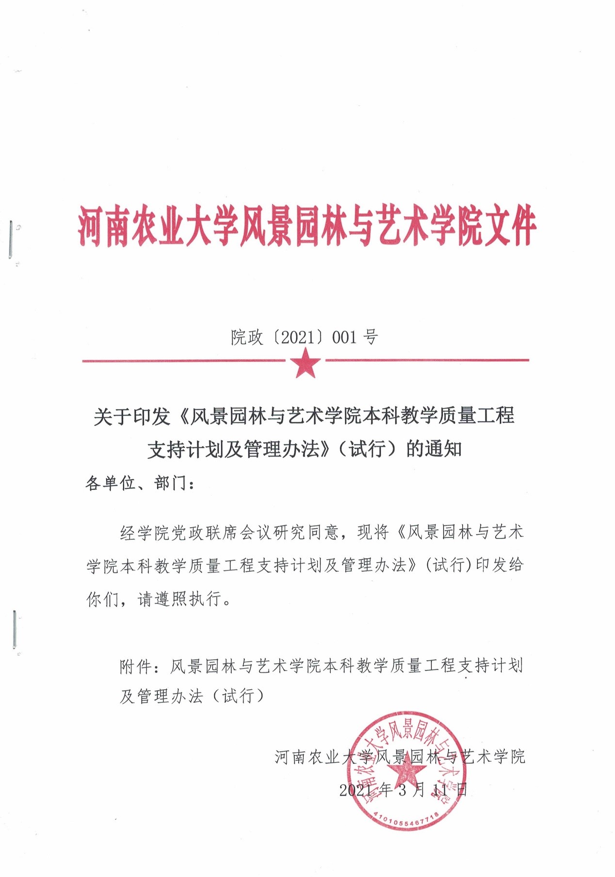 学院成立“教学质量工程”项目考察小组,经过充分调研、论证,院党政联席会于2021年3月11日批准并签署了“关于印发《风景园林与艺术学院本科教学质量工程支持计划及管理办法》(试行)的通知(院政【2021】001号)”文件,正式启动院级“教学质量工程”培育工作。