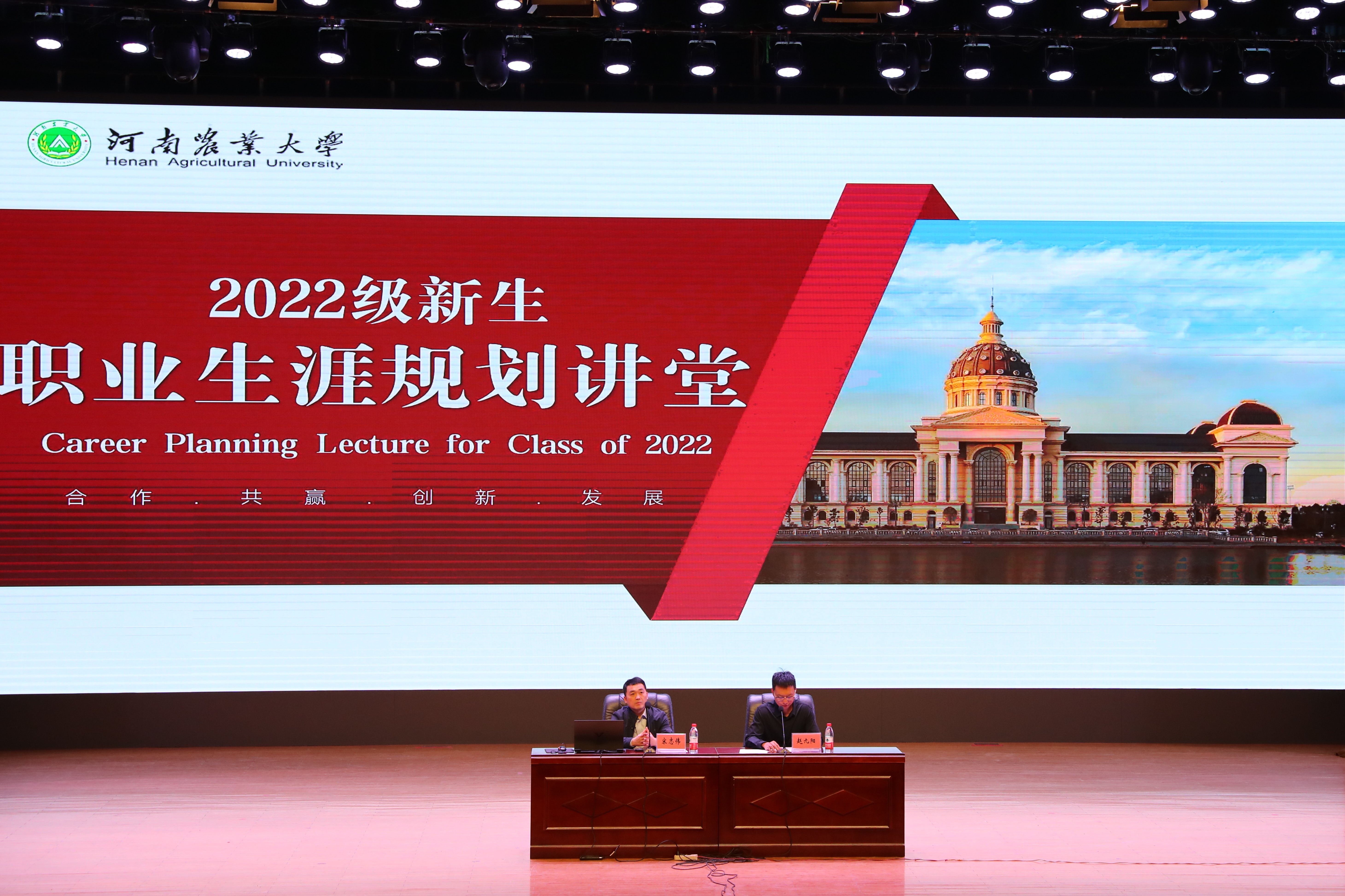 在文化路校区大礼堂举办2022级新生职业生涯规划讲堂。本次讲座由院党委副书记赵九阳主持,优秀校友宋志伟主讲,学院2022级全体新生共同参加。