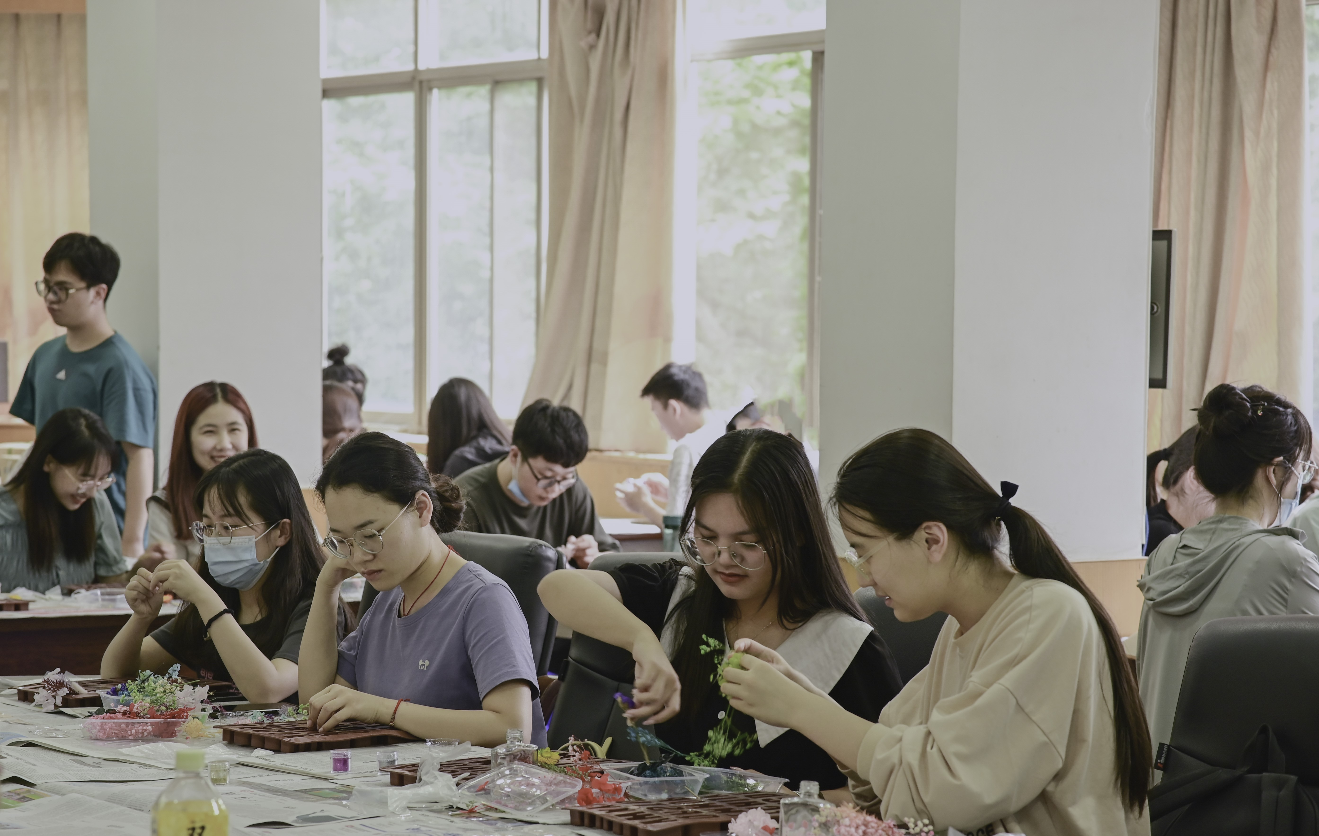 活动开始,首先由花艺协会负责人介绍了不同类型的花卉,然后石力匀老师向同学们讲述作品的制作方法和注意事项,耐心为同学们讲解制作过程可能出现的问题。活动期间同学们都在认真制作自己的滴胶和浮游瓶,想要通过亲手制作的作品向毕业生传达美好祝愿。最后同学们写下对师兄师姐的寄语,将收到的手工作品转交给毕业生们,让景艺毕业学子们可以带着学弟学妹的祝福踏上成功之路。