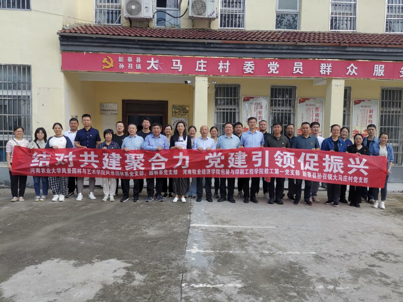 风景园林系教工党支部、园林系教工党支部与河南牧业经济学院包装与印刷工程学院教工第一党支部、驻马店市新蔡县孙召镇大马庄村党支部在大马庄村举行结对共建启动仪式。院党委书记侯永华、党委副书记赵九阳、副院长孔德政及教工支部党员代表,新蔡县人大常委会副主任、孙召镇党委书记田坤琦,大马庄村第一书记杨军,大马庄村党支部书记马明明,河南牧业经济学院包装与印刷工程学院院长张岩、党委副书记李帅堂、教工第一党支部书记卢芳芳及支部党员代表参会。启动仪式由杨军主持。