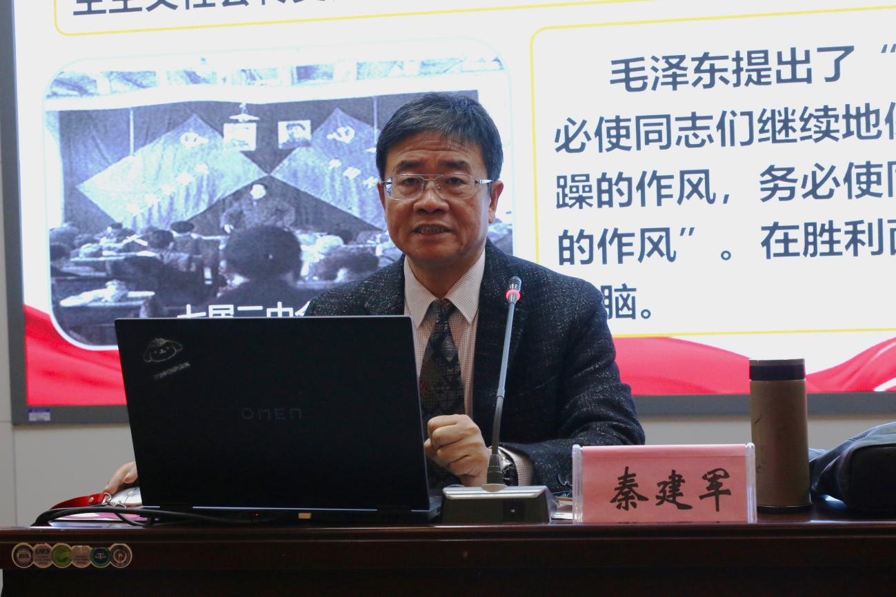 会议伊始,秦教授以学习历史的重要意义开篇,点明党史教育的重要性。他分别从“社会主义革命和建设时期”“社会主义建设艰辛探索时期”以及”改革开放和社会主义现代化建设新时期“三个阶段入手,讲述了中国共产党从建国初期开始,领导和带领人民进行社会主义革命探索的伟大奋斗历程与其中具有代表性的历史事件。同时,也介绍了我校在不同时间节点的发展状况,使师生更加了解百年农大的发展历史。秦教授用幽默风趣的语言,描绘了一幅气势恢宏的历史画卷,为参会师生带来了一堂意蕴深厚的精彩党课。