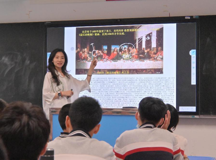 赵晶老师详细解读了达·芬奇的多幅经典作品,从精湛的绘画技巧到作品背后蕴含的深刻思想,用生动有趣的讲解带领学生领略在达·芬奇的艺术世界。学生们全神贯注,为达·芬奇的卓越才华所折服。
