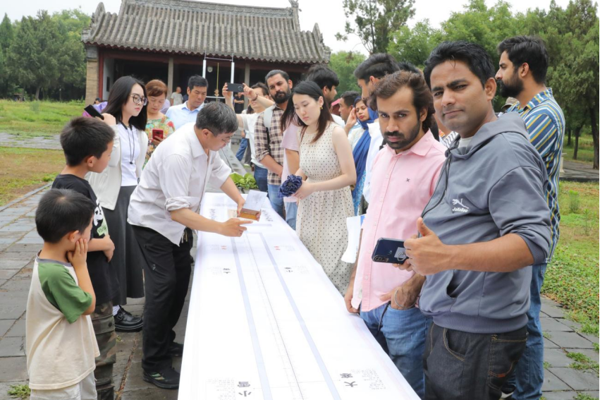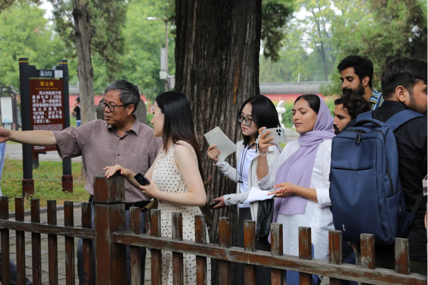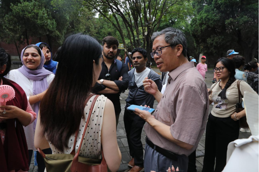 在吕宏军老师的引领下,留学生们依次参观了周公测景台、周公祠、观星台等景点,其中重点讲解了观星台量天尺二十四节气影长示意长卷。吕宏军表示,郭守敬利用观星台,一方面通过小孔成像原理解决了虚影的问题,另一方面通过量观星台天尺上面的水槽解决了水平的问题,这样等分24份确定的二十四节气,达到了空前的精准。留学生们纷纷表示,通过此次夏至日天文科普文化节活动,不仅感受到中国二十四节气的历史文明,更从深处感受到天文文化的博大精深。