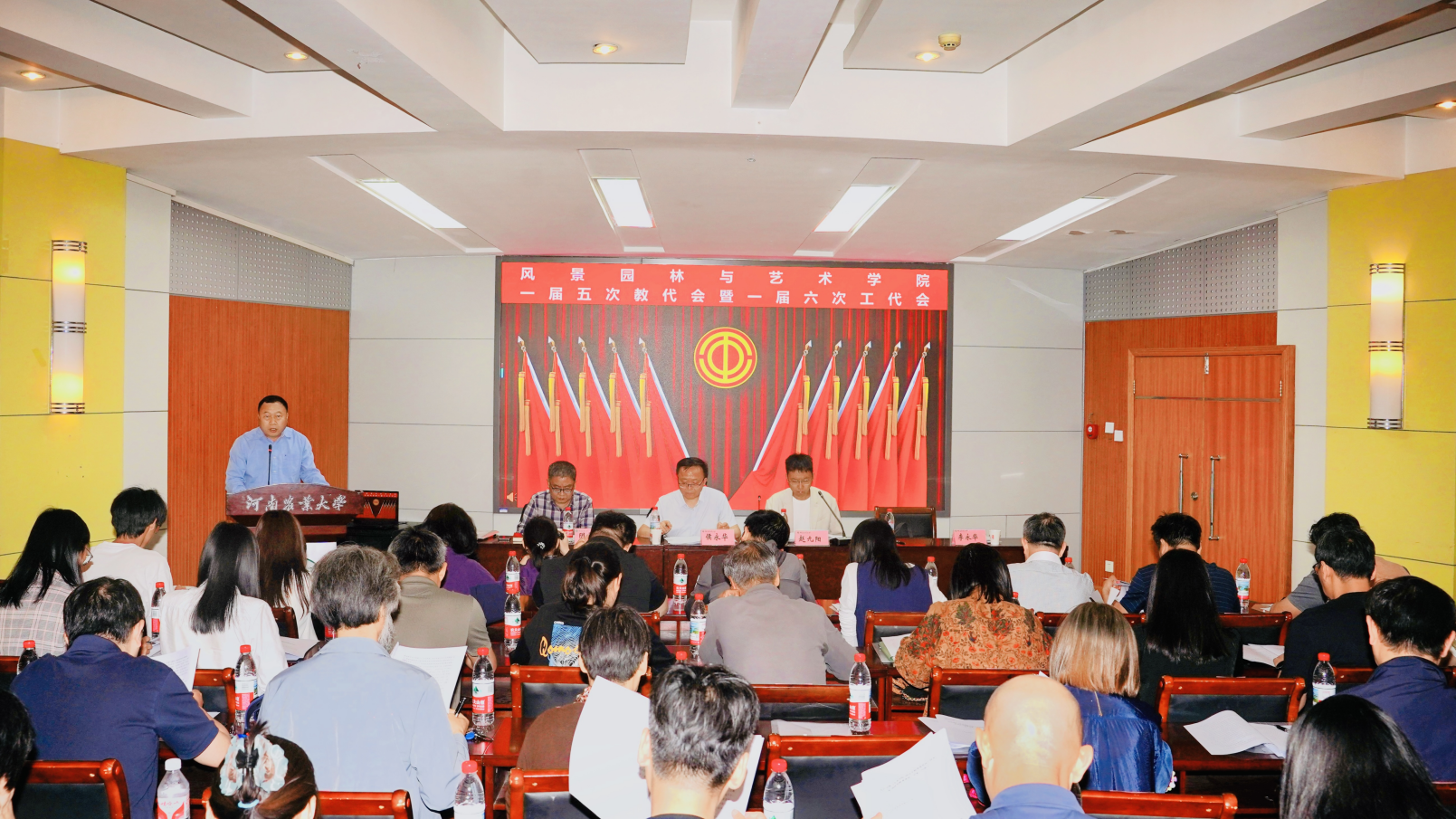 伴随着庄严激昂的国歌声,大会正式拉开帷幕。赵九阳宣读了《关于风景园林与艺术学院召开一届五次教代会暨一届六次工代会请示的批复》。副院长李永华作《院长工作报告》。报告全面深入地回顾了2024年学院在党建引领、学科与人才队伍建设、教育教学、科技创新、对外合作交流、社会服务、学生工作等多方面取得的成果,深刻剖析了学院当前面临的问题与不足,并对2025年的工作思路和重点任务进行了系统规划与部署。报告指出,2025年学院将聚焦六项重点工作:一是强化思想引领,坚决扛牢政治责任;二是紧抓学科和科研建设,提升内涵建设水平;三是重视教师发展,加强师资队伍建设;四是落实立德树人根本任务,着力提高人才培养质量;五是深化开放办学,拓展融合发展成效;六是加强协同合作,做好社会服务工作。