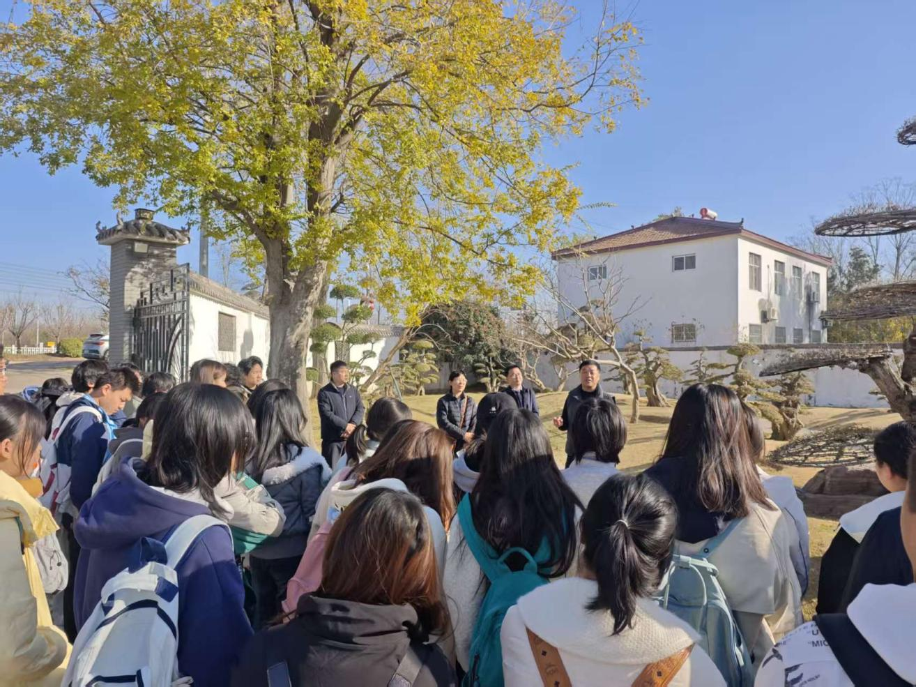首先来到乔磊园林。园主结合基地运营经验,分享了“夏季销售、冬季养护”的季节化管理模式,提出“合适的植物搭配合适的景,才能营造出动人意境”的造景理念,同时介绍了基地正在探索的“苗木种植+景点民宿”融合业态,让师生直观感受到园林产业“美学+实用”的多元拓展方向。随后,前往金地园艺场,园主重点展示了国家二级保护植物对节白蜡以及龟甲龙鳞黑松等珍稀造型苗木。该基地坚持“原创产品自主定价、借鉴创新不照搬”的原则,其培育的对节白蜡因“长寿特性”成为客户青睐的“传代树”。园主还分享了“品质第一、人品第二”的行业准则,强调园林设计需注入文化内核,“让院子有灵魂、越做越精致”。